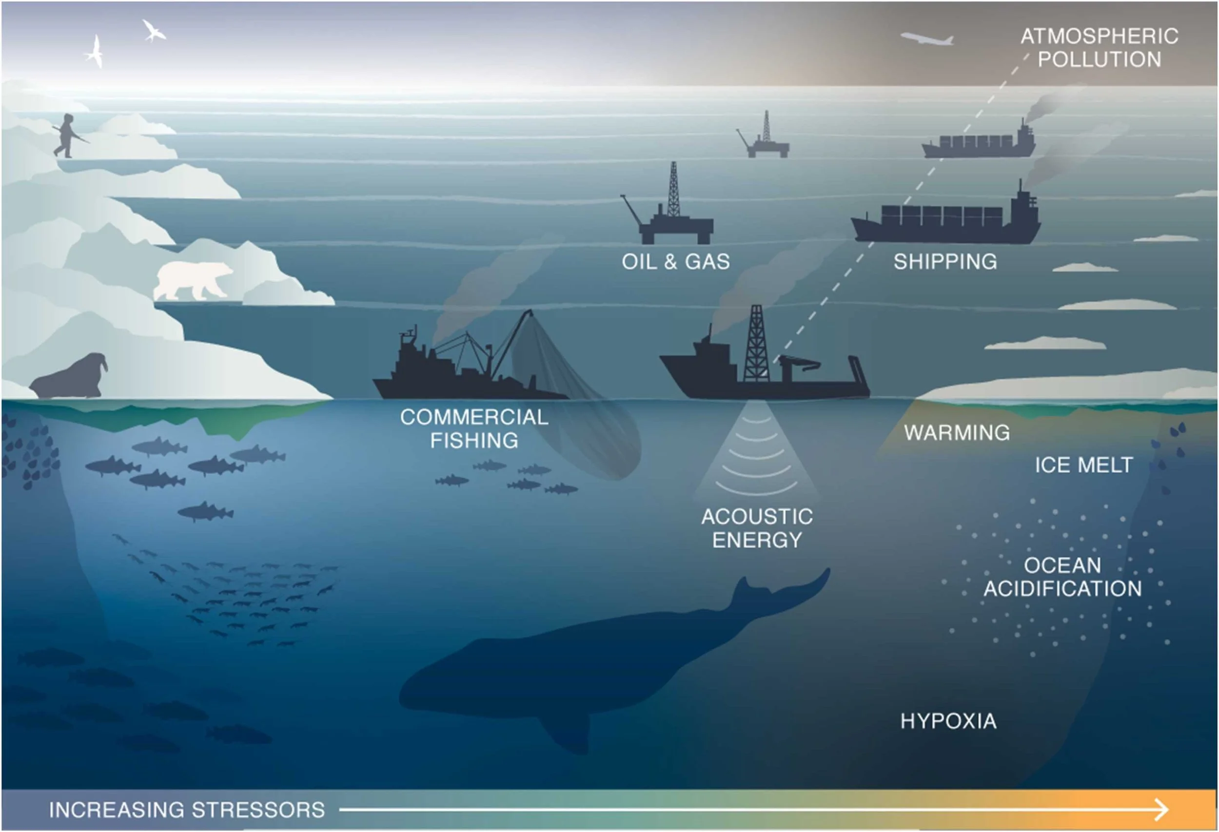 The Arctic Ocean is facing a combination of acute anthropogenic and climate-change related impacts, and is also characterized by a highly productive and relatively simple food web. It is therefore an ideal system for modeling interacting stressors to better anticipate and mitigate large-scale ecosystem consequences.